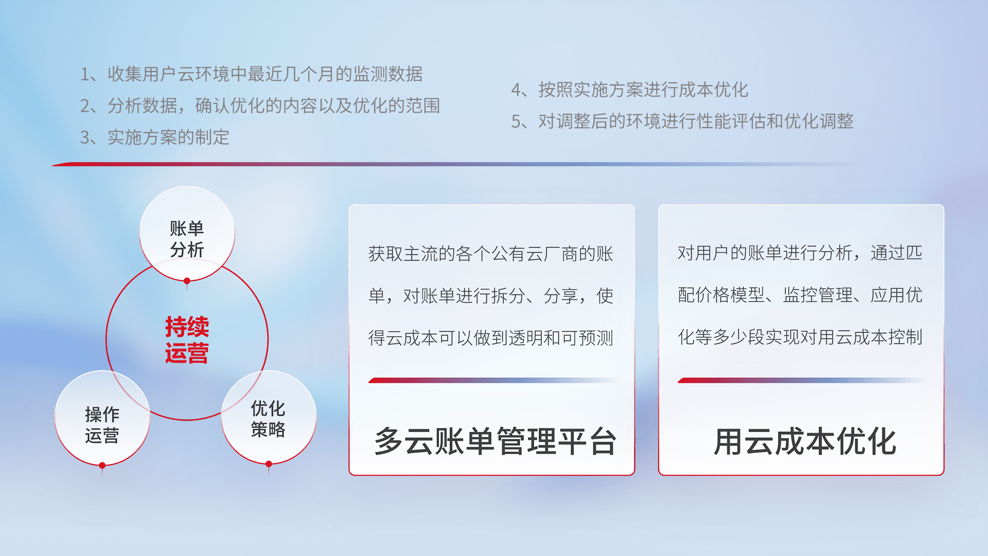 通过多云纳管,,,,以统一的资源数据模型把客户的云资源进行抽象和封装,,,进而实现对多云资源的统一操作,,,保障云资源管理的可靠性、、、稳定性与可用性。。。量身定制化运维内容,,,,配置、、、开发运维、、补丁管理、、、备份、、监控、、、认证和访问管理、、、审计和日常巡检等,,,保障在用云过程中的可靠度,,稳定度以及高可用率。。。。